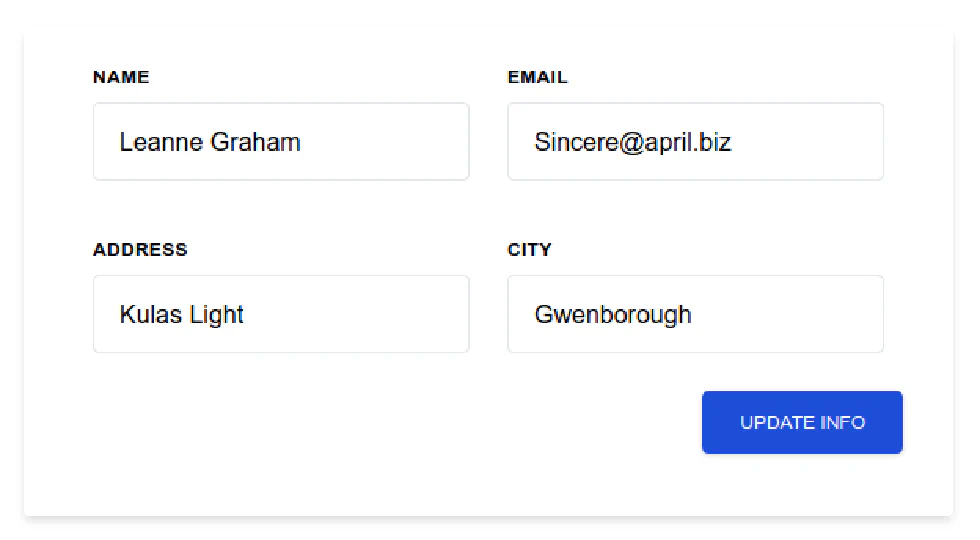 Below you may check up the final result. We use the native JavaScript fetch in an Alpinejs component to receive data to populate the form. You may change the form data, and by clicking on the “update info” button, we are making a POST request to an API Endpoint with the updated data. The endpoint does not exist. Therefore, it returns an error, but I want to show how to use the fetch to make a post request.